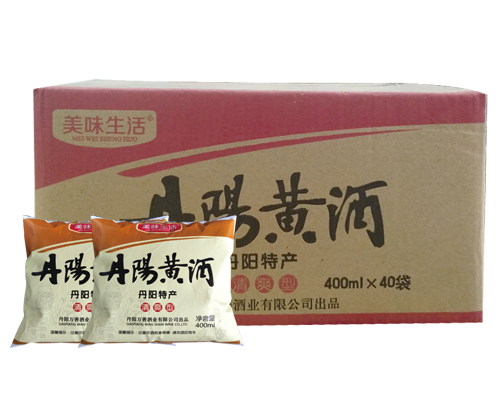 品名: 美味生活袋装黄酒酒精度: 12.0%vol 产品类型: 干型 保质期: 一年 产品等级: 二级 规格: 400ml×40袋 整箱毛重: 16.5KG 整箱净重: 16KG外箱尺寸: 40.5×28.5×21.5cm